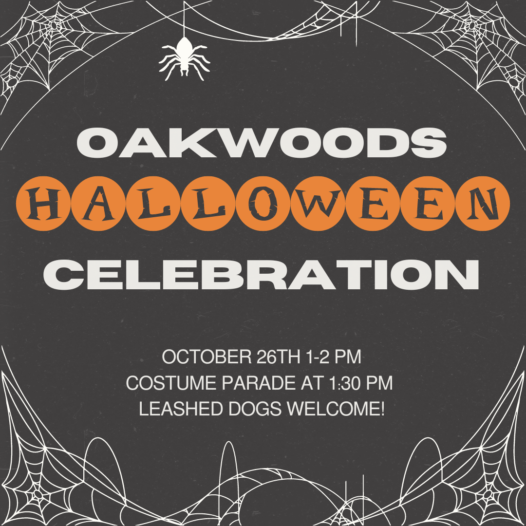 Oakwoods homeowners, their families and friends are invited to come celebrate Halloween at Oakwoods! Costume parade to start at 1:30 p.m. Leashed dogs and dog costumes welcome! All who come in costume will receive a Halloween goodie bag!